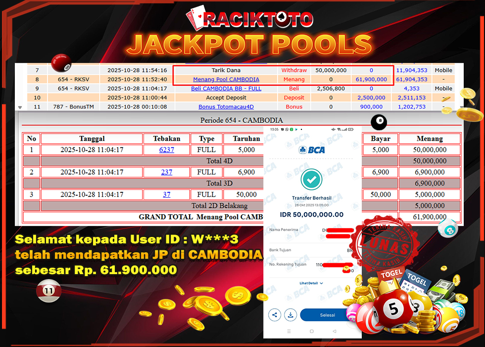 Selamat Kepada User ID : W***3Telah mendapatkan JP besar di CAMBODIA POOLSsebesar 61.900.000Jackpot Berapapun di bayar LUNAS !!BO Aman dan…